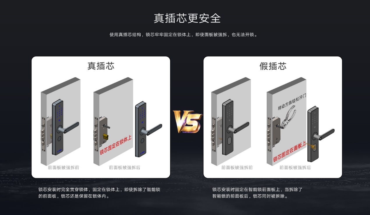 真插芯安裝時完全貫穿鎖體,固定在鎖體上,即使小偷采取暴力手段拆除指紋鎖的前面板,鎖芯還是保留在鎖體內;C級鎖芯技術開鎖需要270分鐘以上,暴力開鎖需要30分鐘以上,小偷也只能望門興嘆了。