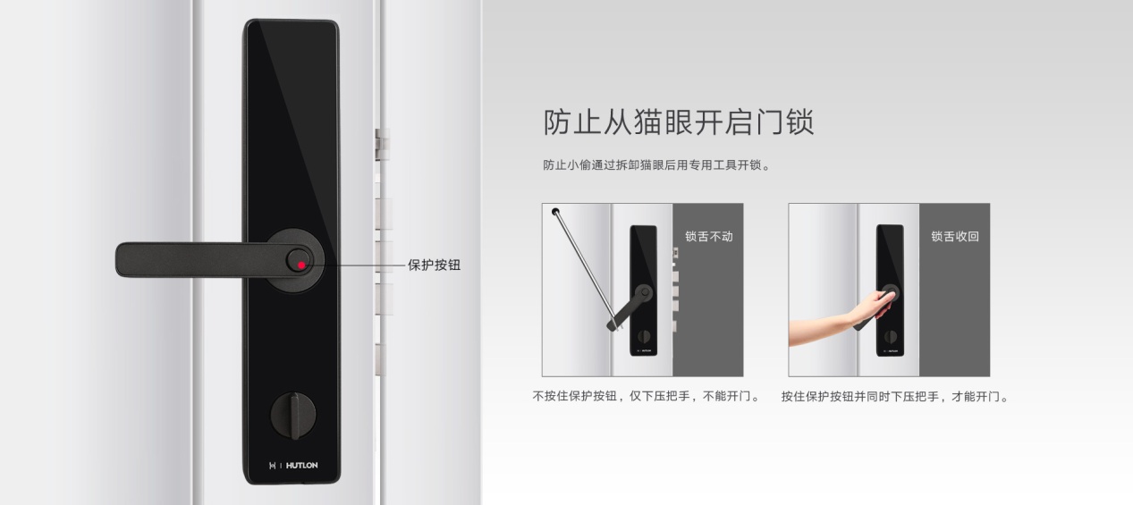 現在有很多小偷會通過拆卸貓眼后用專用工具開鎖。智選智能指紋鎖在室內面板把手上設計了保護按鈕,不按住保護按鈕,僅下壓把手不能開門,按住保護按鈕并同時下壓把手才能開門,防止小偷通過貓眼孔開門。