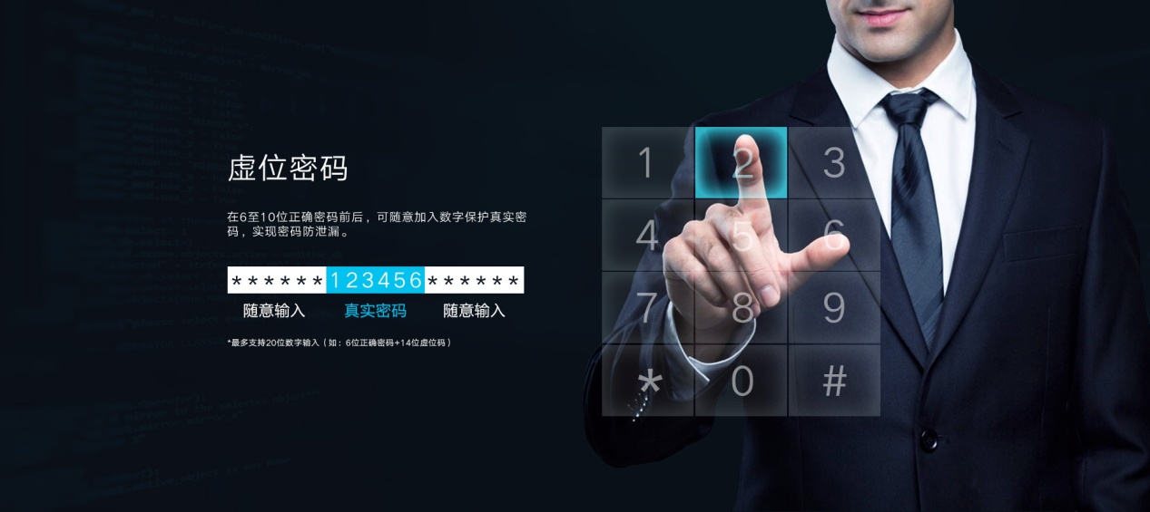 有時候需要用密碼開鎖,旁邊又剛好有人,這時候該怎么辦?不用擔心!盡管用密碼開鎖,虛位密碼功能,讓我們可以在6位正確密碼前后,隨意加入數字保護真實密碼,最多支持20位數字輸入(6位正確密碼+14位虛位碼),實現密碼防泄漏。