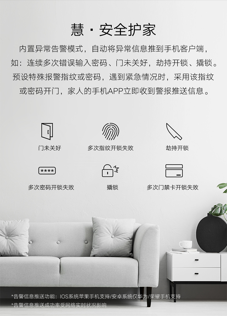 華為智選生態(tài)產(chǎn)品——匯泰龍智能指紋鎖不止步于常規(guī)智能鎖單一的監(jiān)測(cè)功能,創(chuàng)新改進(jìn),采用多鎖舌聯(lián)動(dòng)結(jié)構(gòu),通過(guò)華為智能家居APP可以隨時(shí)監(jiān)測(cè)“門(mén)”的狀態(tài),而不僅僅是業(yè)界普遍支持的對(duì)“鎖”的監(jiān)測(cè),一步到位,實(shí)現(xiàn)對(duì)家門(mén)狀態(tài)更準(zhǔn)確的監(jiān)控,以后再也不用擔(dān)心門(mén)忘記關(guān)。此外,通過(guò)華為智能家居APP還能實(shí)時(shí)接收異常告警,遠(yuǎn)程快速增加指紋/數(shù)字/卡密碼(需在門(mén)鎖上驗(yàn)證管理員管理員身份),以及更改密碼權(quán)限等等。