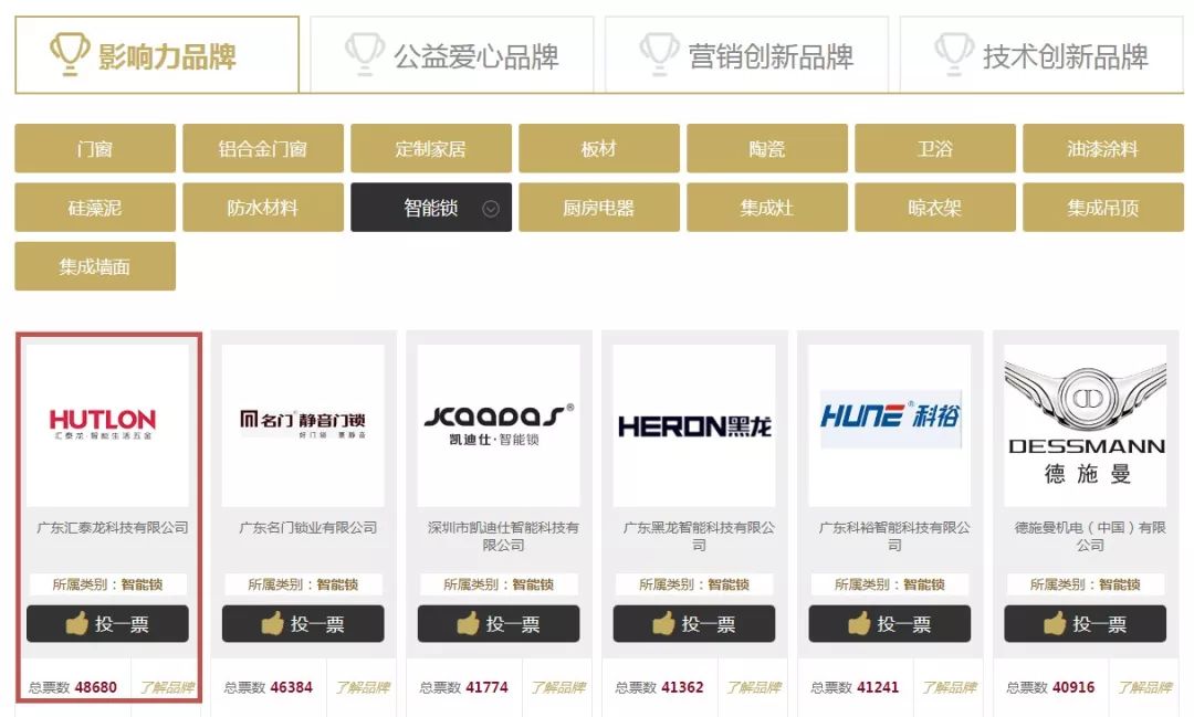 評選中,匯泰龍位列“智能鎖影響力品牌”榜單首位。
