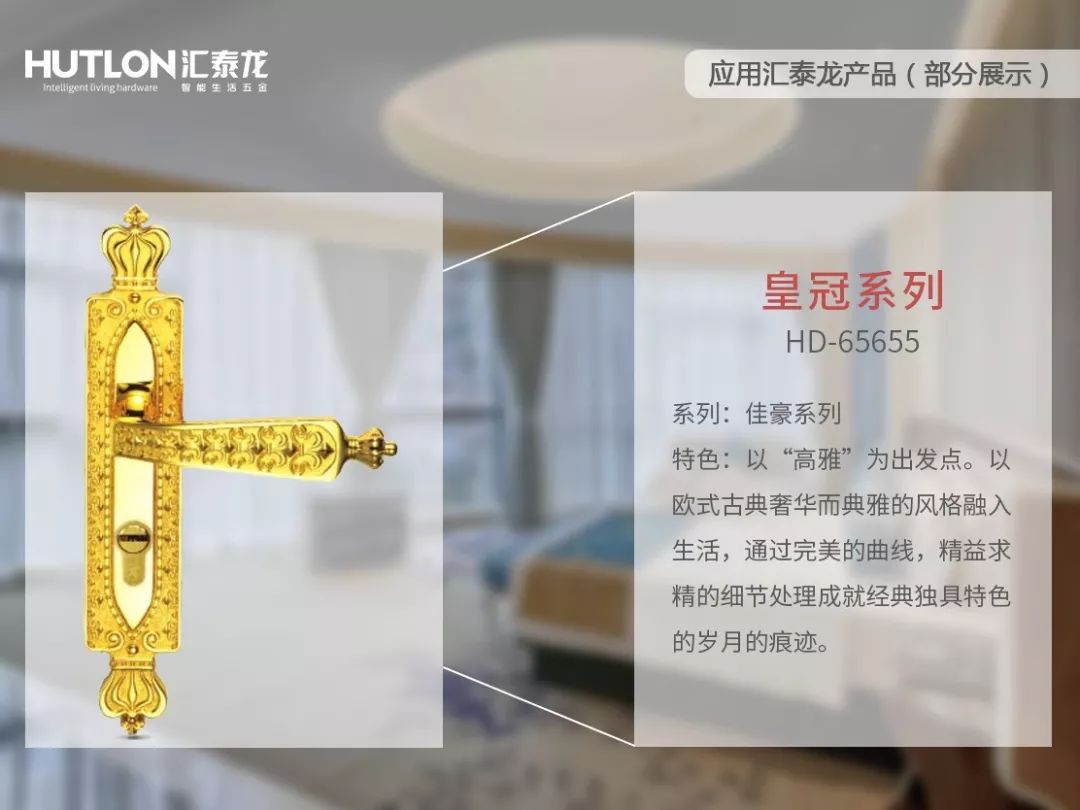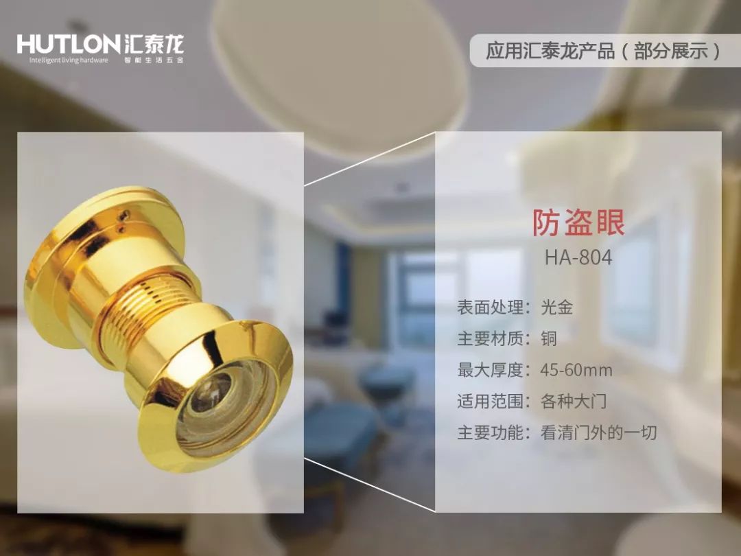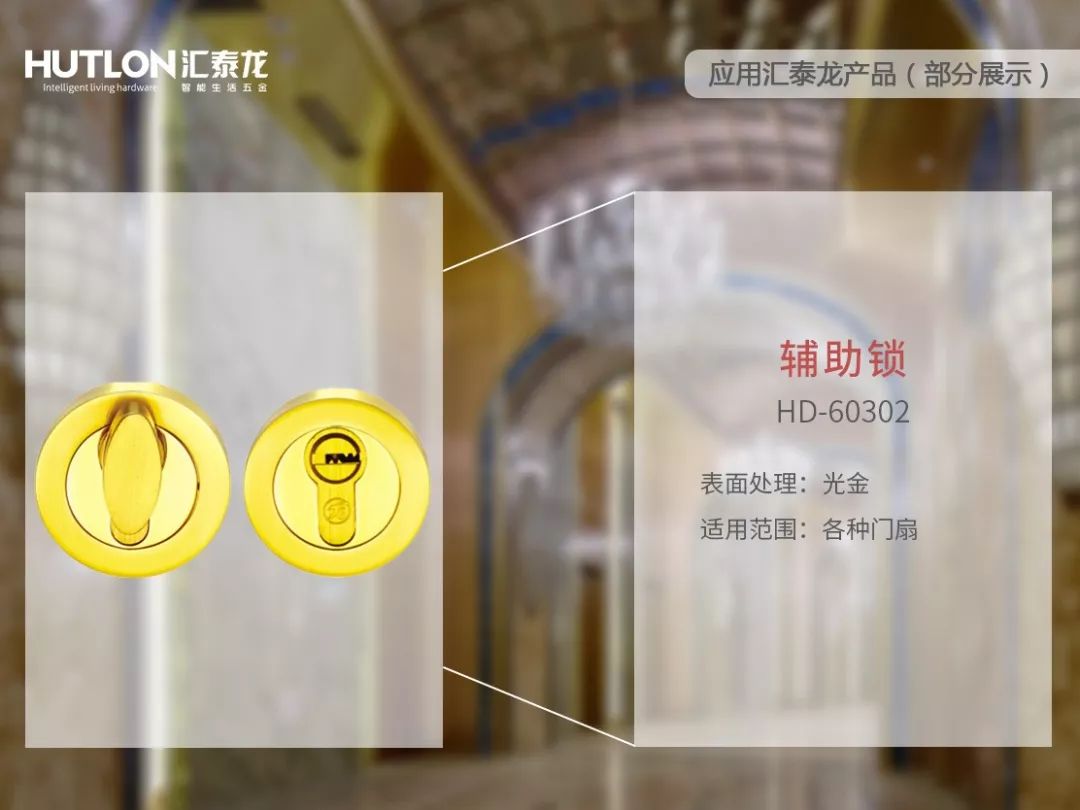 匯泰龍為美輪美奐的超五星蜂巢酒店的客房、浴室等場(chǎng)所提供了涵蓋各式門鎖、閉門器、防盜眼、門底自動(dòng)密封條、豪華大門吸、暗插銷、防盜鏈、衛(wèi)浴掛件套裝、化妝鏡、淋浴房拉手、玻璃門合頁(yè)、輔助鎖等生活五金在內(nèi)的全屋五金解決方案。