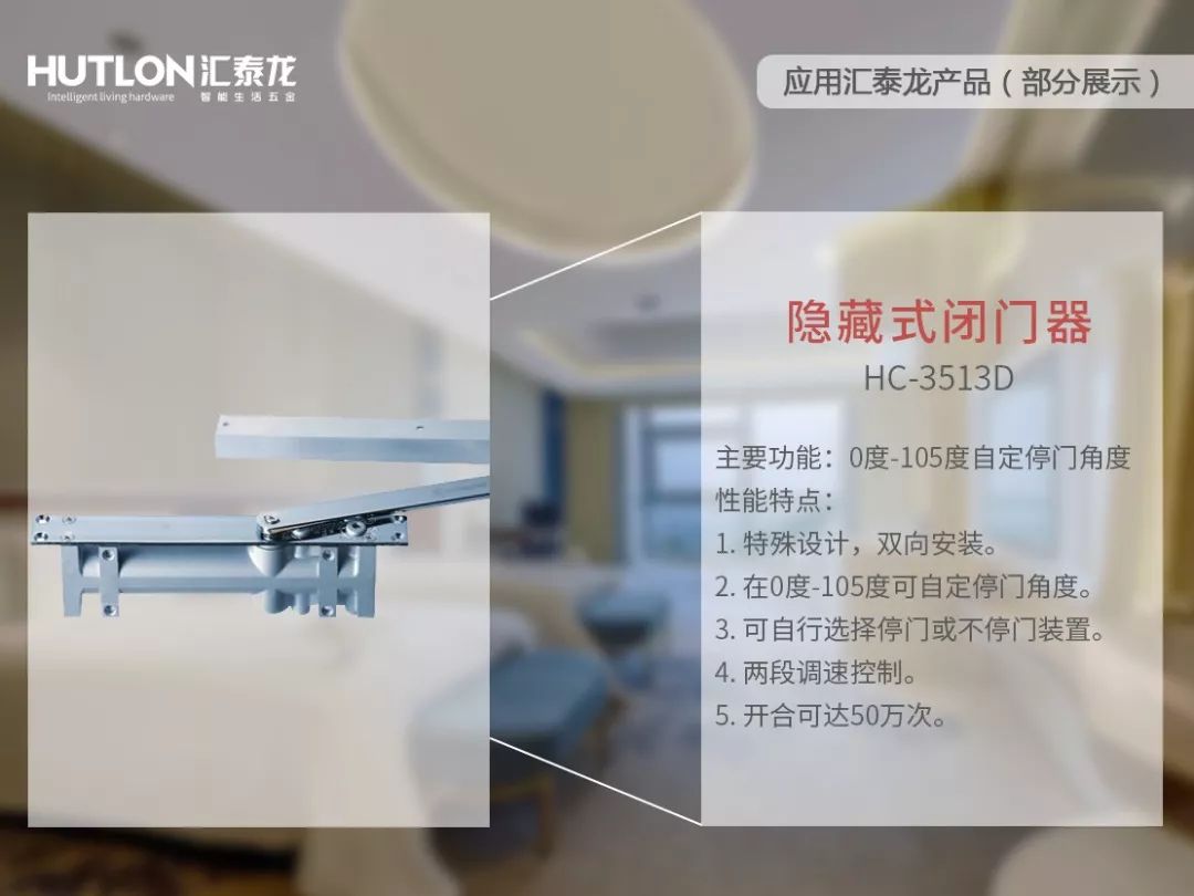 匯泰龍隱藏式閉門器,在0°-105°自定停門角度,兩段調(diào)速控制,自停自閉,安裝與控制簡(jiǎn)易之余,讓客人有更為良好的居住體驗(yàn)。閉門器開(kāi)合可達(dá)50萬(wàn)次,穩(wěn)定性強(qiáng),耐用。與此同時(shí),閉門器采用隱藏式設(shè)計(jì),“鑲嵌”在門內(nèi),不影響美觀。