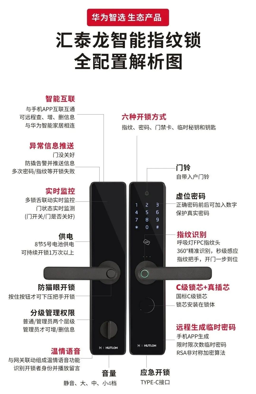 華為智選生態(tài)產(chǎn)品 匯泰龍智能指紋鎖,由匯泰龍與華為智選雙方深度合作共同設(shè)計(jì)打造而成。匯聚匯泰龍二十余年的鎖具經(jīng)驗(yàn),結(jié)合華為“芯、端、云”等多方面的技術(shù)。