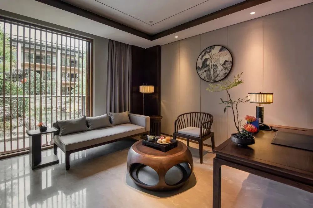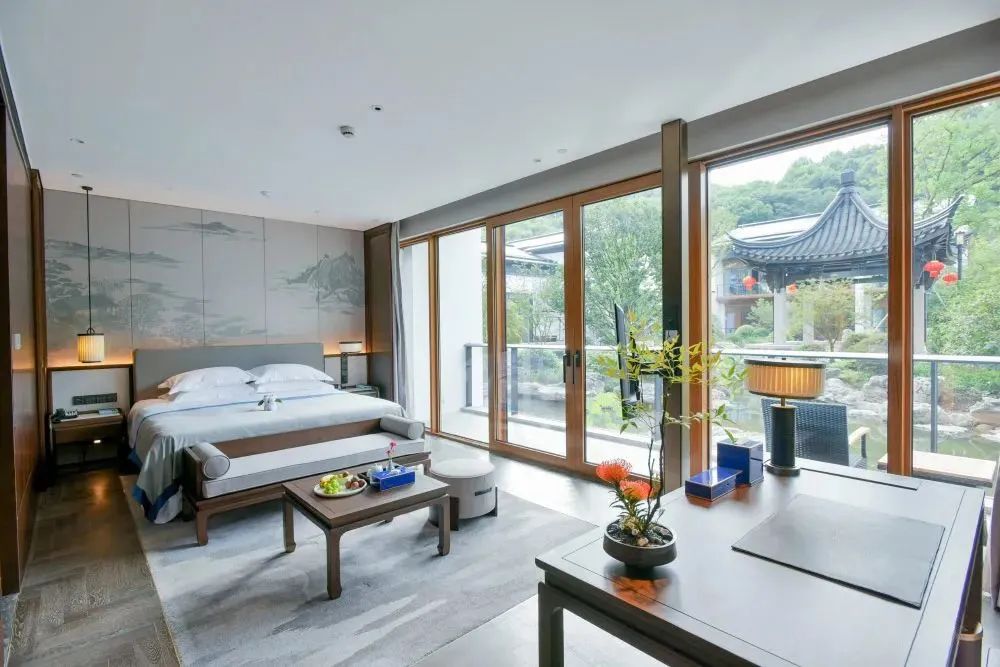 臥室內(nèi)部以中式風格為主,與外圍建筑呼應,讓客人體驗到詩中游,畫中住的居住體驗。