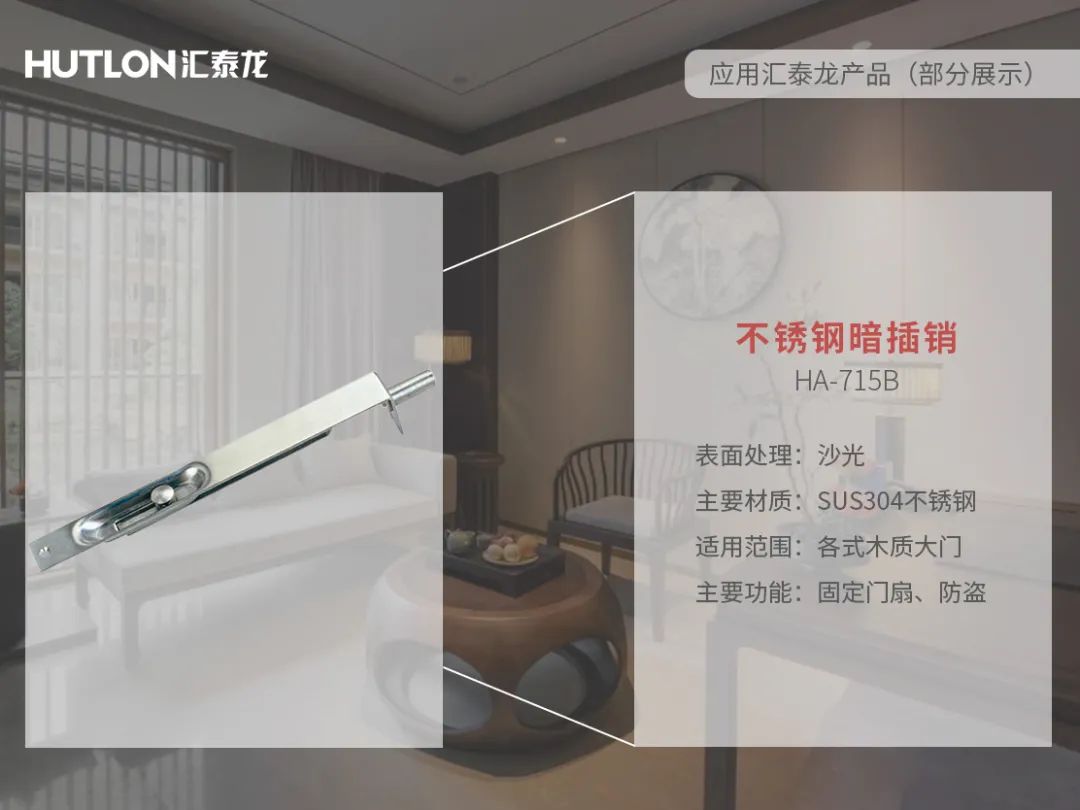 在門五金方面,匯泰龍為嵊州賓館選配了不銹鋼合頁、暗插銷、防塵器、防盜鏈、門底密封條等產(chǎn)品,以滿足門扇承重、室內(nèi)安全、防塵、隔音等客房場景的使用需求。