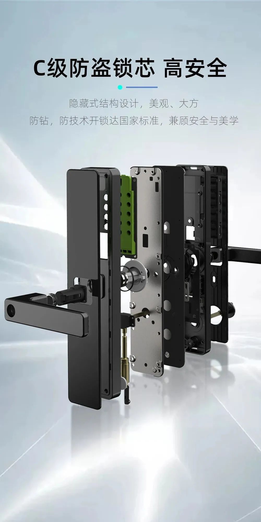 A8 pro旗艦智能鎖采用游離把手設(shè)計,把手回彈后,二次下壓不可開鎖,防止尾隨開鎖。