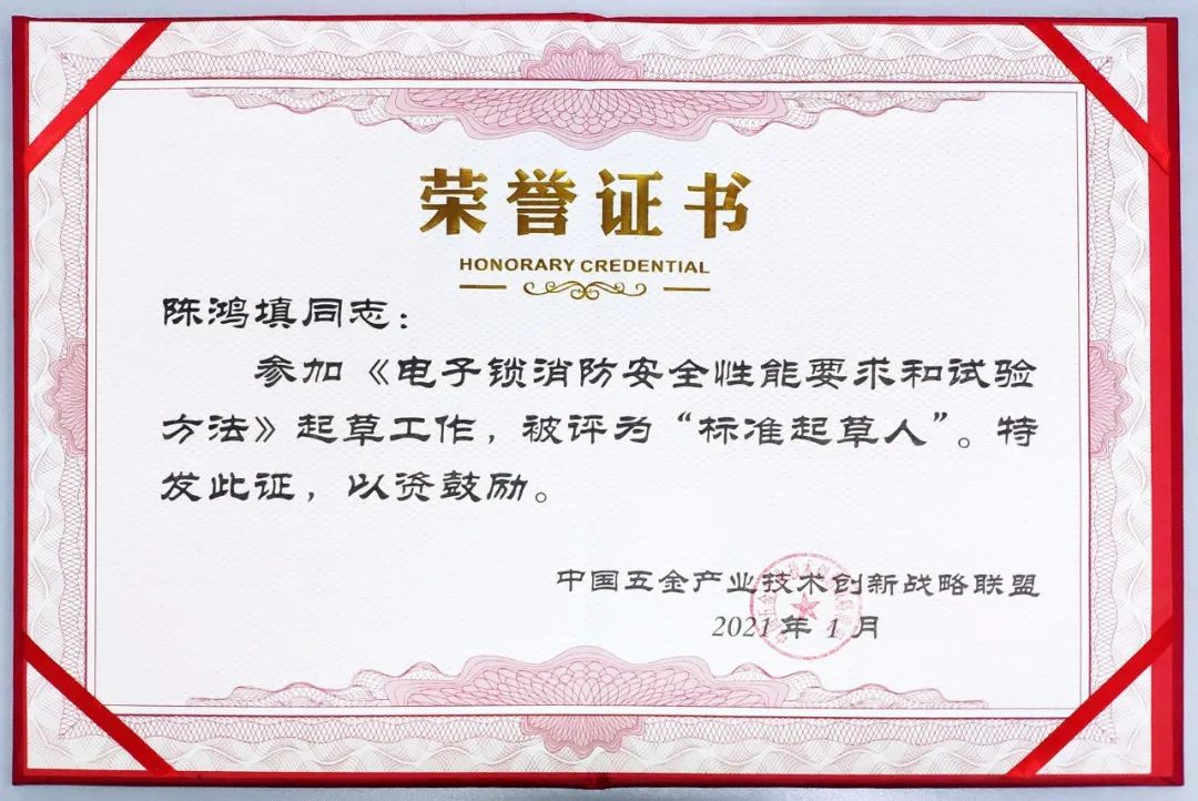 作為《電子鎖消防安全性能要求和試驗(yàn)方法》的起草單位,匯泰龍榮膺“標(biāo)準(zhǔn)起草單位”榮譽(yù);匯泰龍陳鴻填董事長(zhǎng)參與標(biāo)準(zhǔn)的起草,榮膺“標(biāo)準(zhǔn)起草人”榮譽(yù)。