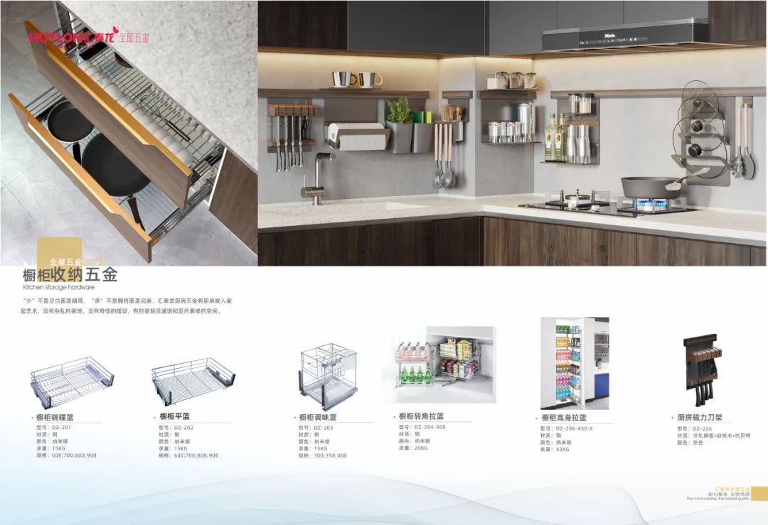 按動(dòng)線(xiàn)規(guī)劃,巧用每一寸平面和立面空間,碗碟籃、平籃、調(diào)味籃、轉(zhuǎn)角拉籃、高身拉籃、升降籃、磁力刀架等多類(lèi)型廚房收納五金,發(fā)揮“小空間,大收納”的作用,將柴米油鹽的生活瑣事變得井然有序,讓廚房承包全家人的“味蕾記憶”。
