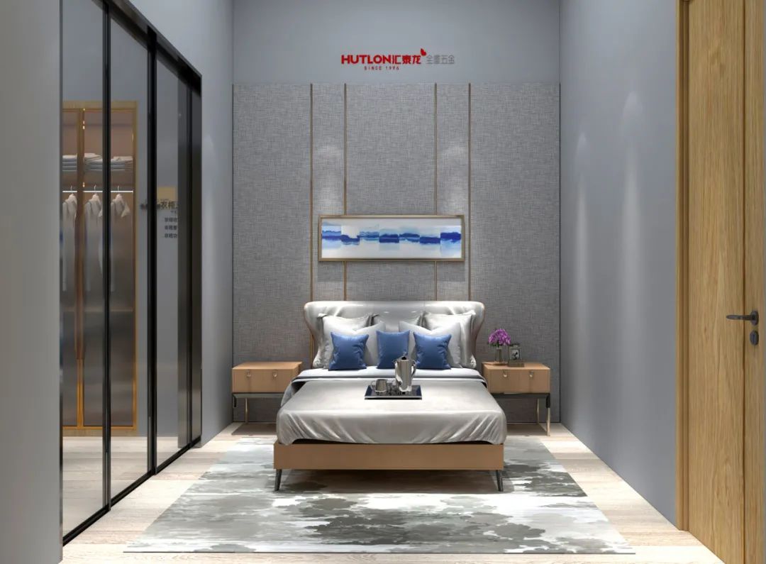 以“匯泰龍全屋五金定制+”為主題的匯泰龍展館,采用高端、極簡的中性灰為主色調,改變產品直接陳列的展示模式,以匯泰龍全屋五金一站式解決方案為基準,將全屋五金產品融合到場景中,一比一還原家居場景,令五金的魅力看得見,摸得著,感受得到。