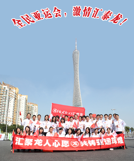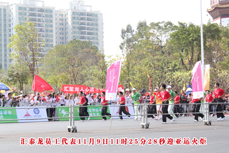 “亞運(yùn)加油!中國加油!匯泰龍加油!”,2010年11月9日11時(shí)25分28秒,當(dāng)?shù)?55棒火炬手經(jīng)過廣州著名標(biāo)志性建筑—廣州塔時(shí),藝洲路上的匯泰龍員工迎火炬代表方隊(duì)響起了潮水般的歡呼聲,氣氛熱烈。四十多名匯泰龍員工手舞國旗、公司旗,舉起寫滿著匯泰龍員工簽名橫副,滿載著全體匯泰龍人對亞運(yùn)的祝福,在大道旁為火炬手歡呼鼓勁,為亞運(yùn)圣火傳遞助威!