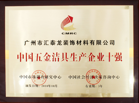 2010年11月,由中國(guó)市場(chǎng)調(diào)查研究中心和中國(guó)社會(huì)經(jīng)濟(jì)決策咨詢中心聯(lián)合組織的“中國(guó)五金潔具生產(chǎn)十強(qiáng)企業(yè)、中國(guó)五金潔具生活十大暢銷品牌”的評(píng)比活動(dòng)結(jié)果揭曉,匯泰龍公司榮膺“中國(guó)五金潔具生產(chǎn)企業(yè)十強(qiáng)”、“中國(guó)五金潔具生產(chǎn)十大暢銷品牌”的稱號(hào),并獲得證書和獎(jiǎng)牌。這是匯泰龍公司再一次榮獲全國(guó)性的獎(jiǎng)項(xiàng),標(biāo)志著企業(yè)品牌進(jìn)一步得到行業(yè)及消費(fèi)者的充分認(rèn)可。此次的評(píng)選結(jié)果將在《中國(guó)日?qǐng)?bào)》和國(guó)家質(zhì)檢總局主管、中國(guó)質(zhì)檢報(bào)刊社主辦的中國(guó)品牌雜志社以及中國(guó)市場(chǎng)調(diào)查研究中心、中國(guó)社會(huì)經(jīng)濟(jì)決策咨詢中心官方網(wǎng)站予以公布。