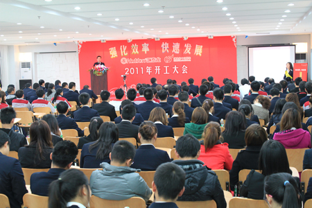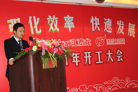 6點半,開工大會準(zhǔn)時開始,董事長陳鴻填先生首先向公司全體員工及員工家人朋友表達(dá)了新年祝福!接著,陳董以“新起點,新目標(biāo)”為主題,和大家共同回顧過去一年全公司所取得的成績,共同檢討過去一年中的不足,闡述公司未來三年的主要發(fā)展規(guī)劃和思路。董事長最后對2011年主題文化——效率年作了詳細(xì)的的詮釋,自此匯泰龍進(jìn)入“強(qiáng)化效率,快速發(fā)展”的效率年。