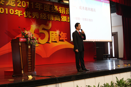 整個(gè)報(bào)告內(nèi)容高瞻遠(yuǎn)矚,陳董指出,在新形勢(shì)下,匯泰龍的大的發(fā)展方向不會(huì)動(dòng)搖,但我們必須改變思維,知已知彼,順應(yīng)市場(chǎng)發(fā)展趨勢(shì),以不斷的創(chuàng)新來(lái)提高自身的核心品牌競(jìng)爭(zhēng)力,他也在新形勢(shì)下也提出了總公司的近期規(guī)劃和對(duì)經(jīng)銷商的期望,讓在座的經(jīng)銷商進(jìn)一步認(rèn)清市場(chǎng)形勢(shì)、時(shí)刻具備市場(chǎng)競(jìng)爭(zhēng)意識(shí)、不斷努力提高銷售業(yè)績(jī),與總公司齊步向前、共同發(fā)展的重要性。陳董最后強(qiáng)調(diào),2011年,匯泰龍的企業(yè)文化主題是“強(qiáng)化效率 快速發(fā)展”更深層次的涵義是:企業(yè)站在新的起點(diǎn),必定會(huì)加快發(fā)展步伐,希望眾多經(jīng)銷商跟上總公司的發(fā)展腳步,齊頭并進(jìn),攜手向前。