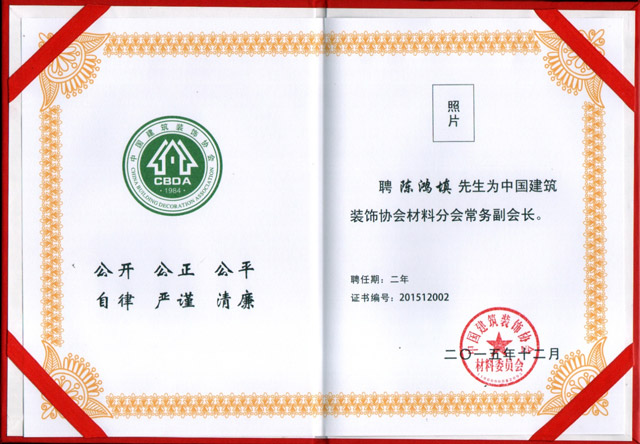 陳鴻填先生被聘為“中國建筑裝飾協(xié)會材料分會常務(wù)副會長”