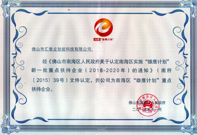佛山市匯泰龍智能科技有限公司被認定為南海區(qū)“雄鷹計劃”重點扶持企業(yè)