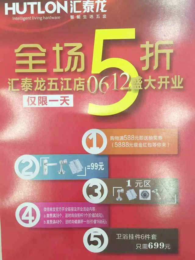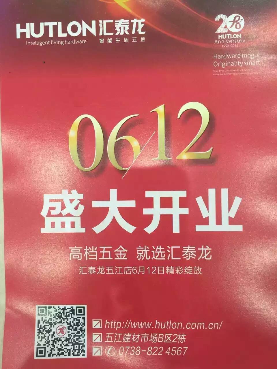 今天,端午節(jié)的假期也結(jié)束了,人們紛紛回歸工作崗位,開(kāi)始新的努力。我們都懷揣著自己的夢(mèng)想,一步一步前行,希望有天會(huì)到達(dá),夢(mèng)想的彼岸。6月12日,這是個(gè)值得慶賀的日子,匯泰龍智能生活五金湖南婁底專賣店在今天盛大開(kāi)業(yè)了!除了全場(chǎng)五折優(yōu)惠,還有各種開(kāi)業(yè)活動(dòng),歡迎前來(lái)選購(gòu)體驗(yàn)!