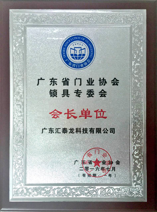 匯泰龍榮獲廣東省門業(yè)協(xié)會鎖具專委會會長單位