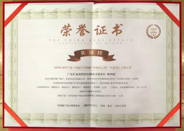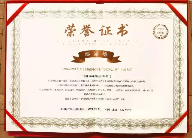 匯泰龍榮獲“‘2016-2017[第十四屆]中國地產(chǎn)年度風(fēng)云榜’年度大獎”