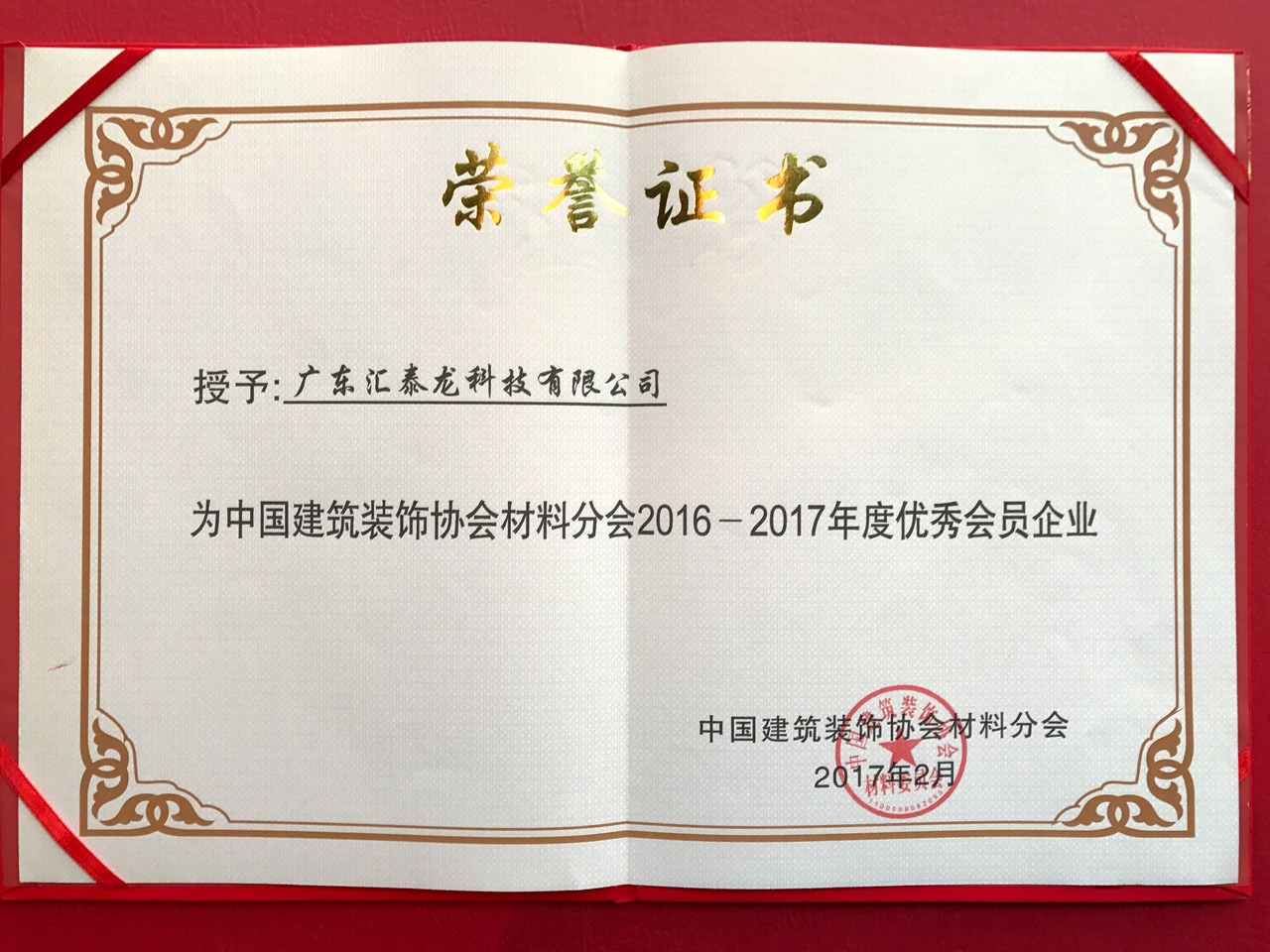 匯泰龍公司以其先進的研發(fā)能力,極高的技術水平及強大的行業(yè)領域影響力、市場占有率和良好的口碑,獲得了消費者的好評和業(yè)界同仁的一致認可,連任「中國建筑裝飾協(xié)會材料分會常務副會長單位」,匯泰龍董事長陳鴻填先生受聘為「中國建筑裝飾協(xié)會材料分會常務副會長」,同時匯泰龍榮膺「2017年度中國建筑裝飾協(xié)會材料分會優(yōu)秀會員單位」。