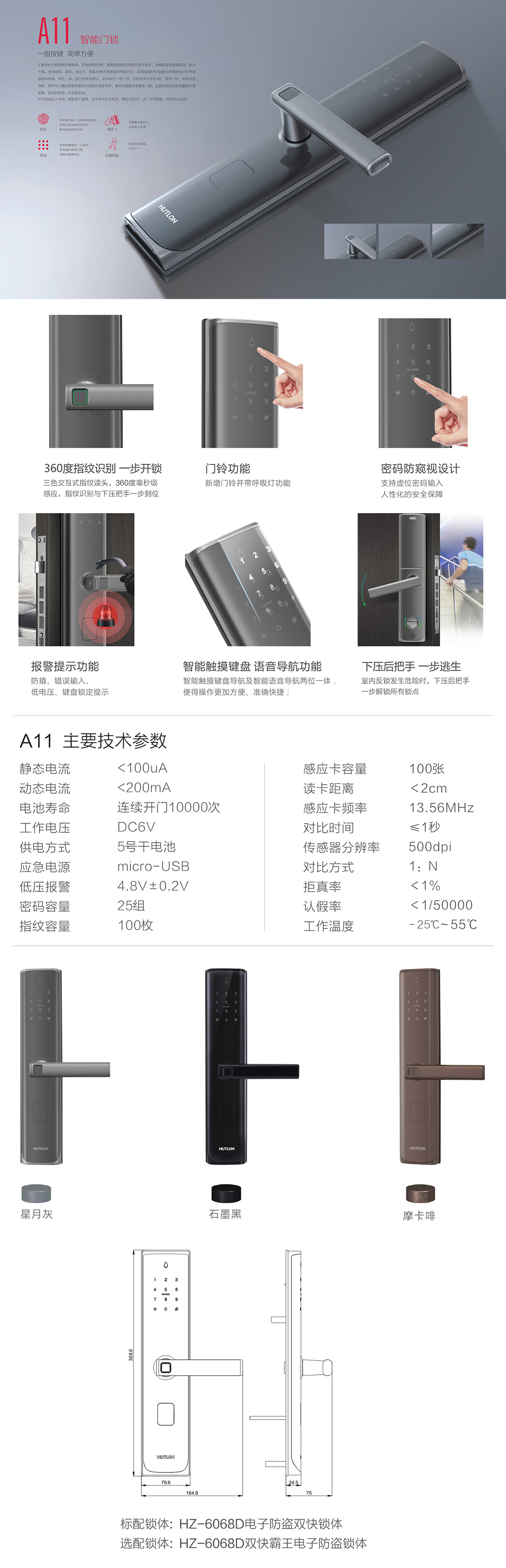 支持指紋、密碼、感應卡及機械鑰匙四合一開鎖方式;