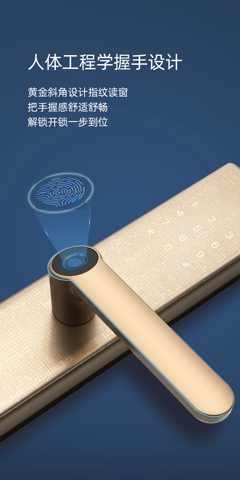 .半導(dǎo)體指紋頭設(shè)計(jì)在把手上,識(shí)別率高,識(shí)別速度快,指紋識(shí)別和下壓把手一步開(kāi)門(mén)