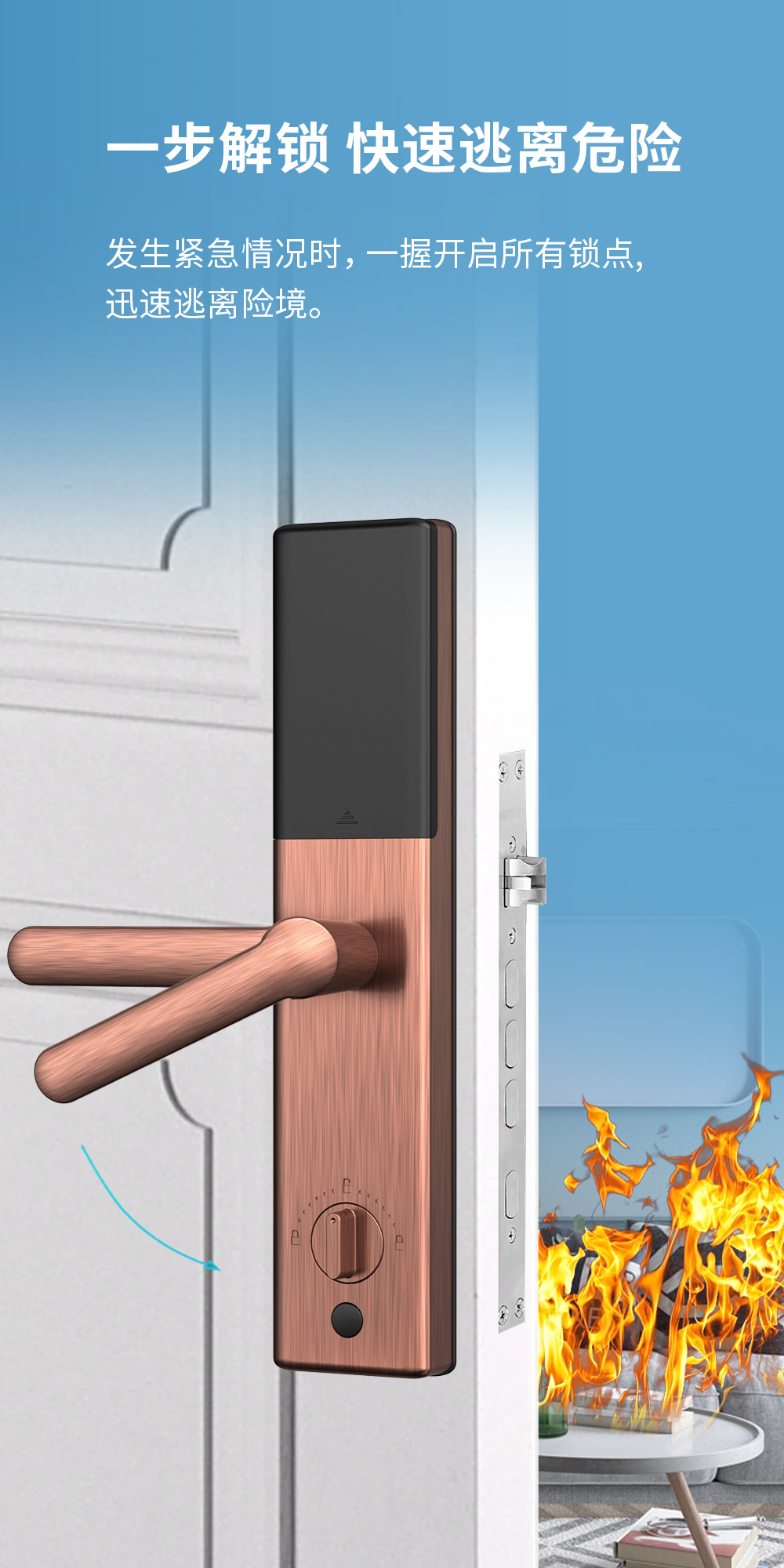 支持指紋、密碼、感應(yīng)卡、機(jī)械鑰匙四合一開鎖方式;