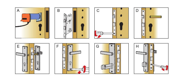 4安裝內(nèi)外面板,使把手轉(zhuǎn)動順:擰緊螺釘(如上圖:E-F)。