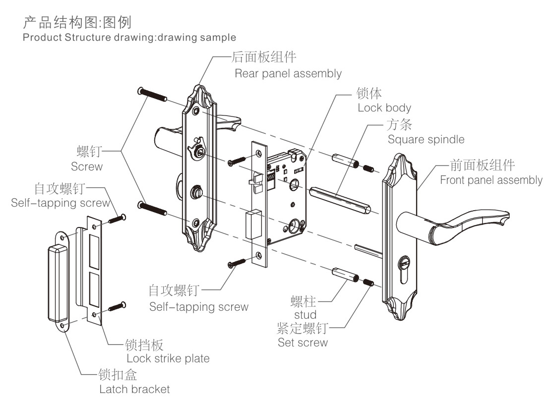 6擰緊螺釘,安裝扣板及扣盒,對齊鎖體,應(yīng)使鎖舌與之配合順暢,擰緊螺釘(如上圖:H)。