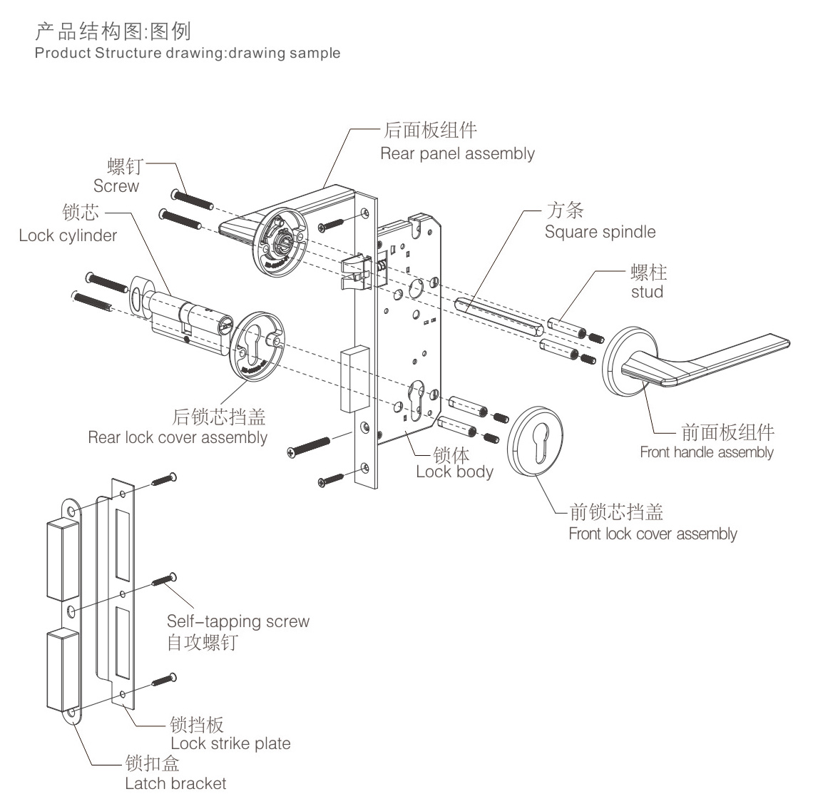 2、將鎖體放入孔;預(yù)緊襯板螺釘,分別從鎖圈和執(zhí)手圈上拆出外蓋,將方桿穿過門板插入鎖體(如下圖:B-D)。